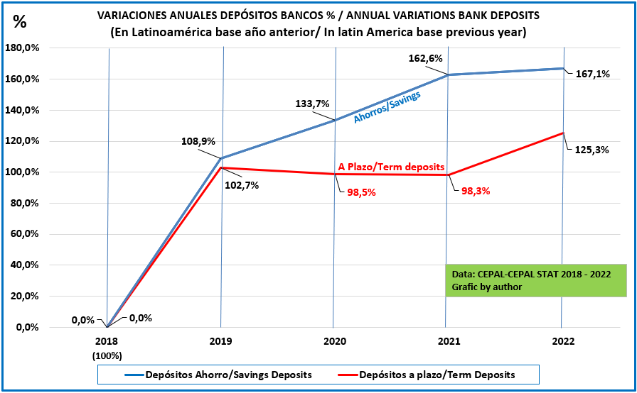 Aunque las carteras de ahorro parecen ser más volátiles que los depósitos a Plazo Fijo, cuando la realidad es que los depósitos de ahorro siempre tienden a crecer (Ver el siguiente gráfico de basado en la data de CEPALSTAT que muestra el comportamiento de los depósitos de ahorro y los depósitos a Plazo Fijo desde 2018 hasta 2022).